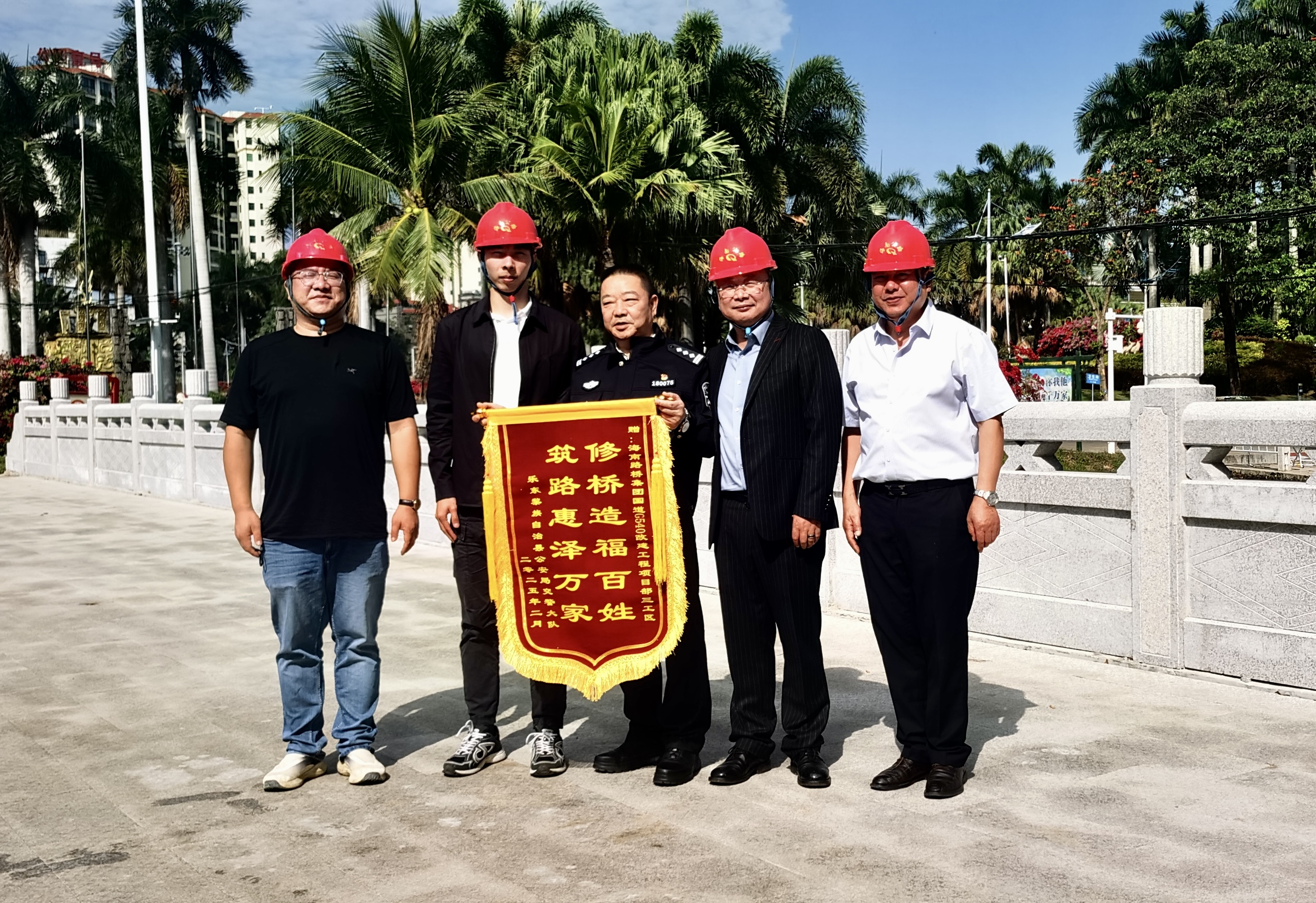 近日,海南乐东县交警大队教导员周武等一行亲临海南路桥建设工程有限公司国道G540改建工程项目部,向项目部赠送绣有"修桥造福百姓 筑路惠泽万家"的锦旗。海南路桥建设工程有限公司副总经理周景龙、海南项管部总经理庄国良、项目经理汪成岗代表全体建设者受赠。